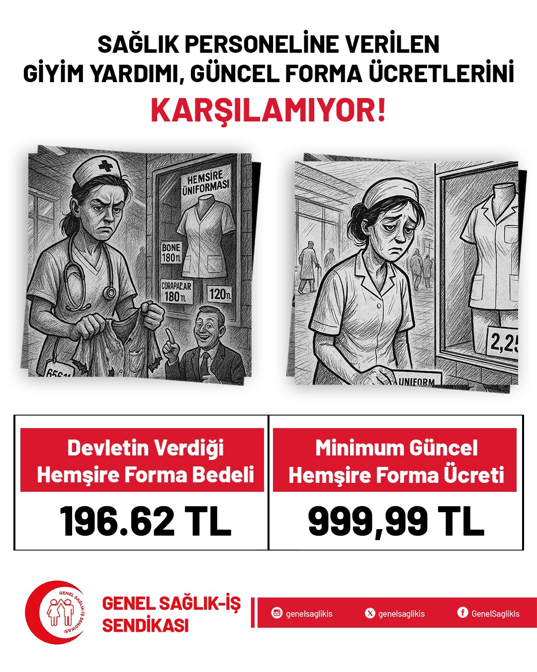 Örneklendirmek gerekirse; bir hemşire formasının piyasa fiyatı ortalama bin TL iken Bakanlığın verdiği tutar sadece 196,62 TL’dir. Sağlık Bakanlığın iş ayakkabısı için ödediği tutar 255 TL’dir. Bu fiyat gerçek piyasada ancak 2 çift çoraba denk gelse de Bakanlık bunun adına “yardım” demeye utanmamaktadır. Sağlık emekçileri, giyim yardımlarının yetersizliği nedeniyle bu ihtiyaçlarını kendi ceplerinden, her gün biraz daha zayıflatılan bütçelerinden karşılamak durumunda kalmaktadır.