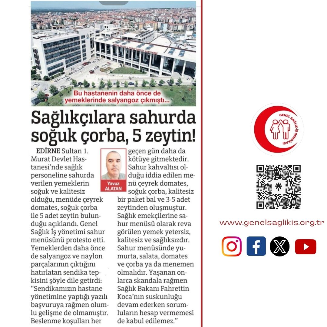 Edirne 1. Sultan Murat Devlet Hastanesi’nde sağlık emekçilerine reva görülen yemeklerle ilgili yaşanan sıkıntıları dile getirdiğimiz haberimiz (bugün) 23 Mart 2024 tarihli SÖZCÜ gazetesinde yayınlandı. Sağlık çalışanları, kamu kurum ve kuruluşlarında hijyenik olmayan, yetersiz ve dengesiz gıdaları yemek zorunda bırakılmamalıdır.
