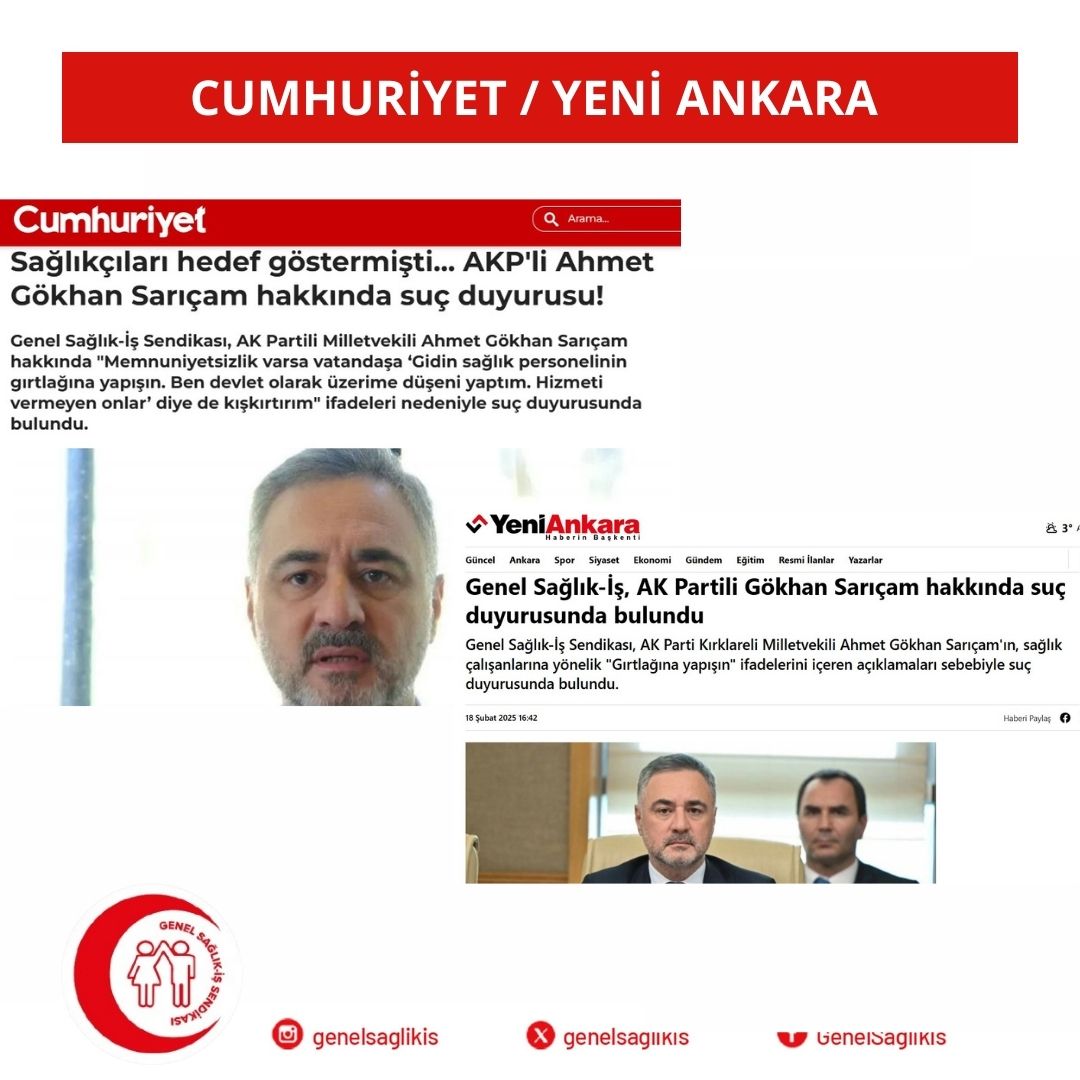 Genel Sağlık-İş Sendikası, AK Partili Milletvekili Ahmet Gökhan Sarıçam hakkında "Memnuniyetsizlik varsa vatandaşa ‘Gidin sağlık personelinin gırtlağına yapışın. Ben devlet olarak üzerime düşeni yaptım. Hizmeti vermeyen onlar’ diye de kışkırtırım" ifadeleri nedeniyle suç duyurusunda bulundu.