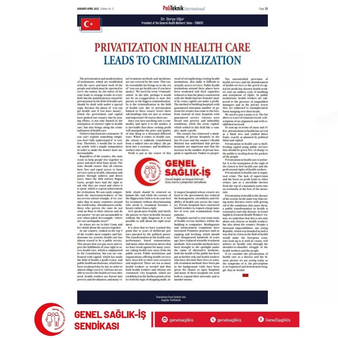 Sağlıkta özelleştirme, sistemin hastalığıdır. Nasıl ki birçok hastalığı tedavi etmek önce onu var eden koşullardan kurtulmakla başlıyorsa, bu hastalığın iyileşmesi için de sağlıkta yeniden kamusal bir dönüşüm şarttır.