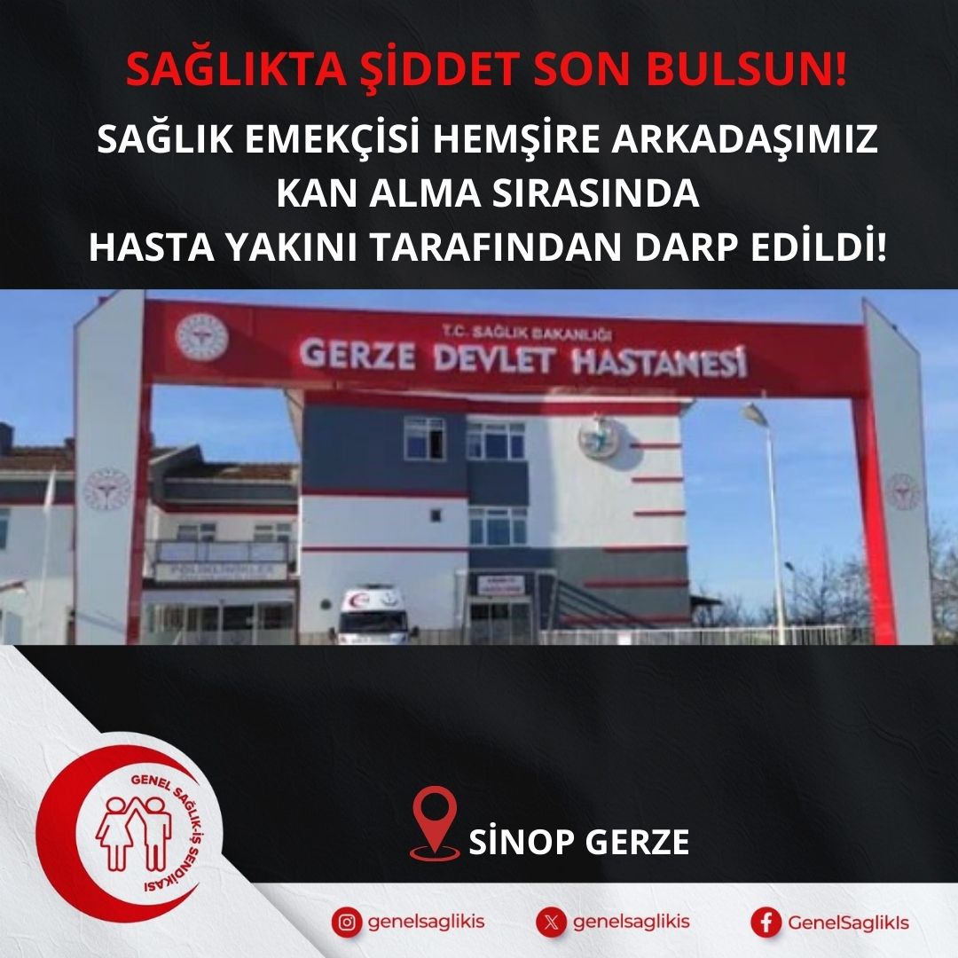 Bugün, Sinop Gerze Devlet Hastanesi'nde görev yapan sağlık emekçisi ve hamile olduğu öğrenilen hemşire arkadaşımız, hasta yakınları tarafından kan alma esnasında darp edilmiştir. Can kurtarmak için fedakarca görevini yapmaya çalışan sağlık emekçilerinin can güvenliği olmadan çalıştığının örneğini bir kez daha görmüş bulunmaktayız. Genel Sağlık-İş olarak, "Etkin ve Uygulanabilir Sağlıkta Şiddet Yasası'nın" çıkması gerektiğini defaatle dile getirmemize rağmen hala bununla ilgili önemli bir adım atmayan siyasi iktidar ve uyguladığı sağlık politikaları sonucu Sağlıkta Şiddet son bulmamaktadır. Sağlıkta Şiddet Yasasının derhal tüm sağlık bileşenlerince müzakere edilerek yürürlüğe girmesini bir kez daha dile getiriyor, şiddete uğrayan hemşire arkadaşımıza acil şifalar diliyoruz...