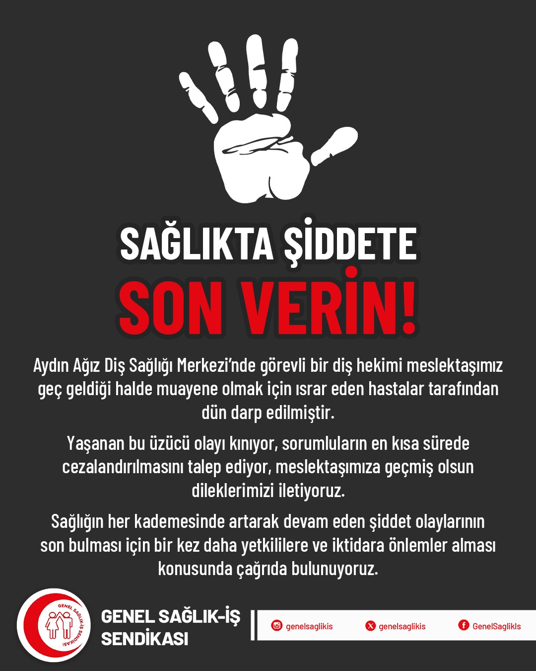 Sağlığın her kademesinde artarak devam eden şiddet olaylarının son bulması için bir kez daha yetkililere ve iktidara önlemler alması konusunda çağrıda bulunuyoruz.