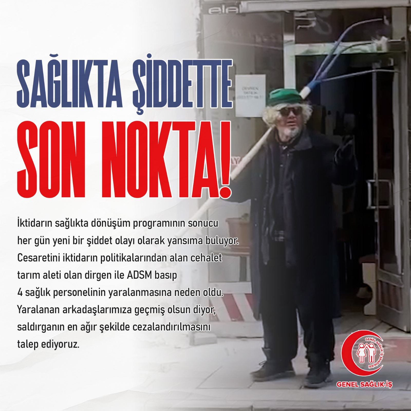 İktidarın sağlıkta dönüşüm programının sonucu her gün yeni bir şiddet olayı olarak yansıma buluyor. Cesaretini iktidarın politikalarından alan cehalet tarım aleti olan dirgen ile Aksaray ADSM'yi basıp 4 sağlık personelinin yaralanmasına neden oldu. Yaralanan arkadaşlarımıza geçmiş olsun diyor, saldırganın en ağır şekilde cezalandırılmasını talep ediyoruz.