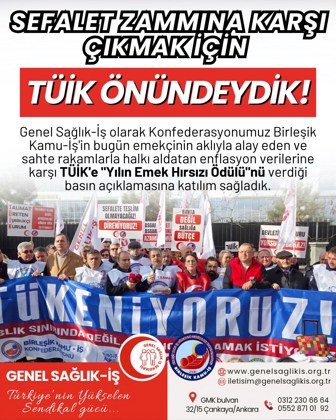 "SEFALET DAYATMASINA BOYUN EĞMİYORUZ" Kamu emekçisi ve emeklisini açlık sınırına yakın ücretlere mahkum edenlere karşı Konfederasyonumuz Birleşik Kamu-İş’in TÜİK önünde düzenlediği basın açıklamasına katılım sağladık. Sefalete teslim olmayacağız, susmayacağız, geri adım atmayacağız. Yaşasın Emek Mücadelemiz Yaşasın Birleşik Kamu-İş Yaşasın Genel Sağlık-İş