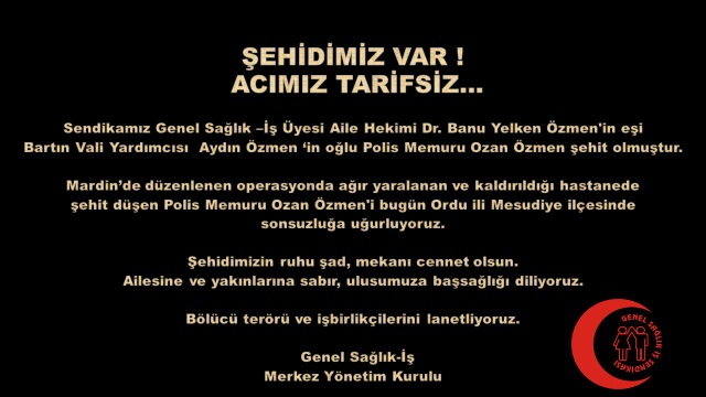 Sendikamız Genel Sağlık –İş Üyesi Aile Hekimi Dr. Banu Yelken Özmen'in eşi Bartın Vali Yardımcısı Aydın Özmen ‘in oğlu Polis Memuru Ozan Özmen şehit olmuştur.