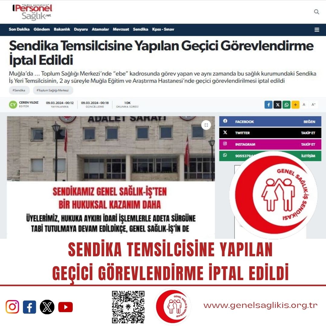 Sendikamız Genel Sağlık-İş'in saglikpersoneli.com.tr'de çıkan haberi: https://www.saglikpersoneli.com.tr/sendika-temsilcisine-yapilan-gecici-gorevlendirme-iptal-edildi