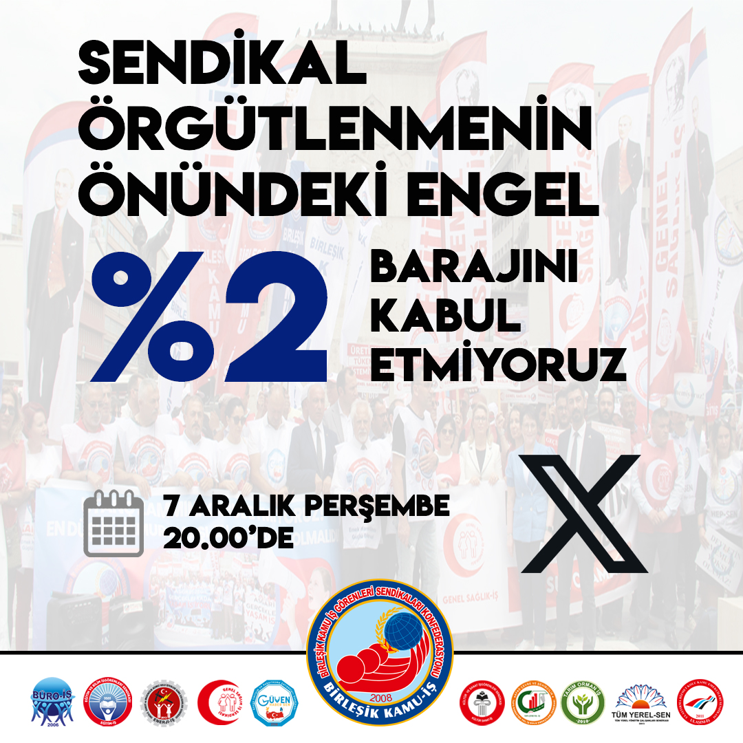 Hükümetin sendikalara dayattığı, sendikal faaliyette bulunma özgürlüğünü engelleyen %2'lik baraj sınırını getiren yasal düzenlemeyi protesto etmek için; 7 Aralık 2023 Perşembe saat 20.00'de X Platformunda etkinlik düzenlenecektir.