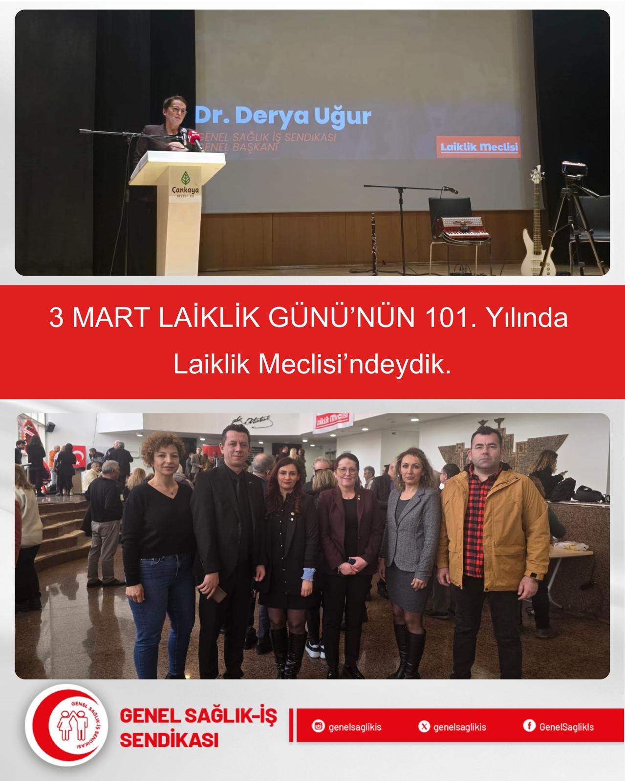 Sendikamız Genel Sağlık-İş olarak Laiklik Meclisinin 3 Mart Laiklik Gününün 101.yıldönümü kutlamalarına katıldık. Genel Başkanımız Derya Uğur'un konuşmacı olarak bulunduğu toplantıya Genel Sekreterimiz Veli Can Karabacak, Genel Dış İlişkiler ve Bilişim Sekreterimiz Erman Açıkgöz, Genel Merkez Denetleme Kurulu Üyelerimiz Güldeste Dedeoğlu ve Deniz Şenkal, Bursa Şube Başkanımız Hatice Şeker Erdoğan katılım sağlamıştır.