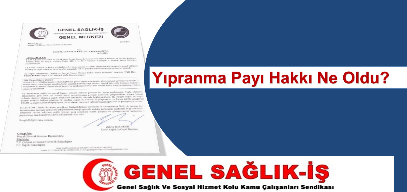 2015 yılında imzalanan Toplu Sözleşmede, sağlık çalışanlarının fiili hizmet süresi zammı (yıpranma payı hakkı) konusunda çalışma yapılması ve yapılacak çalışmanın 2016 yılı sonuna kadar sonuçlandırılması kararı alınmıştı. Ancak 2016 yılının bitmesine az bir süre kalmasına rağmen, sağlık emekçileri tarafından merakla beklenen fiili hizmet süresi zammı ile ilgili olarak somut bir çalışma henüz ortaya konulmadı. Sendikamız Sosyal Güvenlik Kurumu’na bir yazı göndererek ‘’ Toplu sözleşme hükümlerine göre 2016 yılı sonuna kadar tamamlanması gereken komisyon çalışmalarının sonucunu’’ sordu.