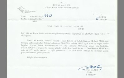 “İlimiz Ali Osman Sönmez Huzurevi Yaşlı Bakım ve Rehabilitasyon Merkezi Müdürlüğü Hemşire kadrosunda olup, Valilik Makamının 28.08.2014 tarih ve 14963 sayılı oluru ile İnegöl Yenice Engelsiz Yaşam Bakım Rehabilitasyon ve Aile Danışma Merkezine geçici görevlendirilen Göksel SÖĞÜT ‘e ilişkin ilgi yazınız ekinde gönderilen Genel Sağlık –İş Sendikasının 18.09.2014 tarih ve 472 sayılı yazıları ve ilgili personelin 24.09.2014 tarihli dilekçesine istinaden geçici görevlendirmesi iptal edilmiştir.” ifadesiyle durdurulmuştur.