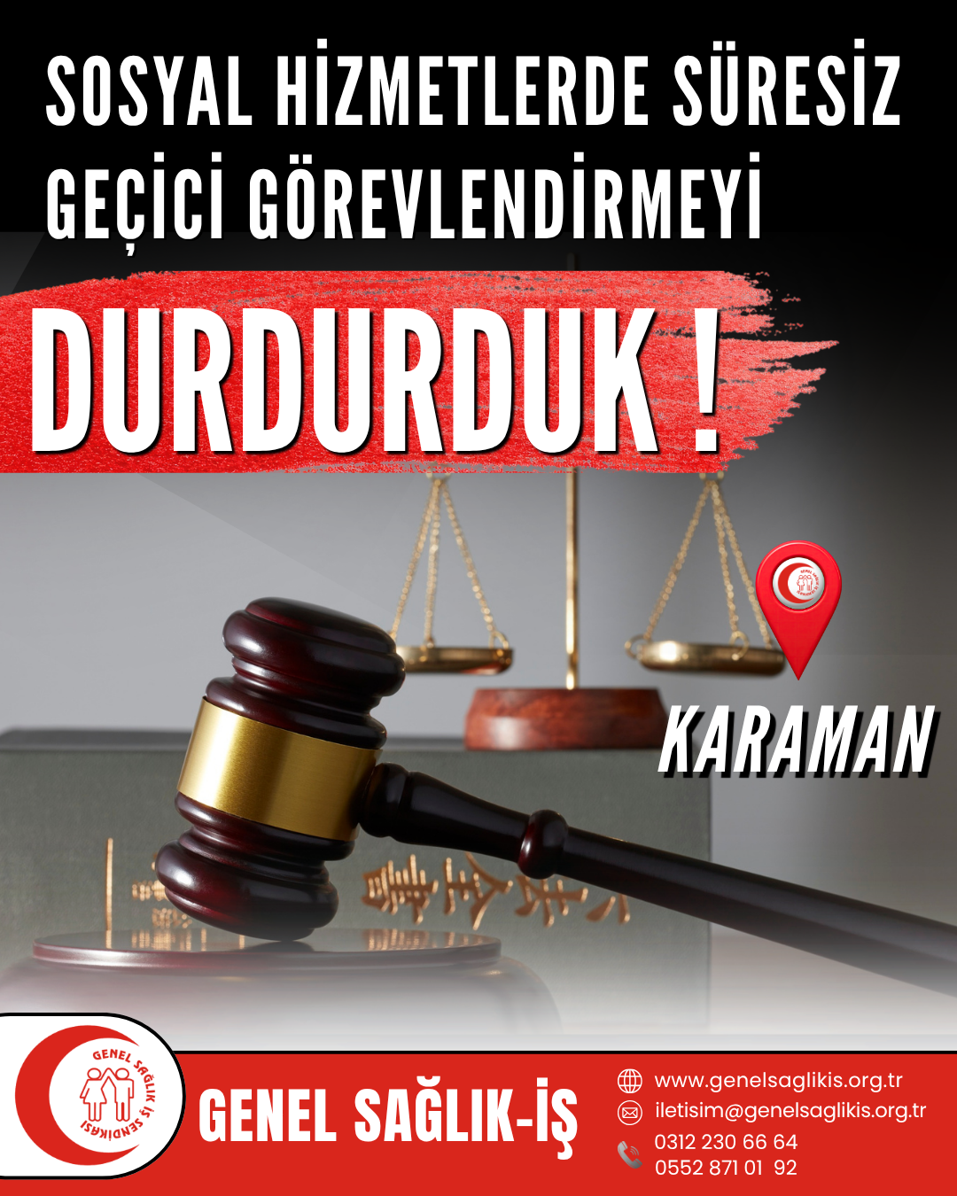 Sendikamız Genel Sağlık-İş tarafından Karaman Valiliğinin hukuka aykırı işleminin iptali istemiyle açılan davada Mahkeme; dava konusu işlemle yapılan geçici görevlendirme her ne kadar süre belirtilerek yapılmış olsa da uzatılmasını hukuken haklı kılabilecek somut gerekçe, bilgi ve belgenin davalı idarece ortaya konulmadığını tespit etmiştir. Ayrıca, davacının aynı yerde dava konusu işlemden önceki 6 aylık süreçte de geçici olarak görev yaptığı, bu durumun görevlendirmenin geçici niteliğini ortadan kaldırarak fiilen daimi bir nitelik kazandırdığı belirtilmiştir. Davacının, kadrosunun bulunduğu görev mahalli dışında, kendi istemi olmaksızın bir yıl gibi uzun bir süreyle geçici olarak görevlendirilmesinin hakkaniyete uygun olmadığı gerekçesiyle, yargılama sonuna kadar yürütmenin durdurulmasına karar verilmiştir.