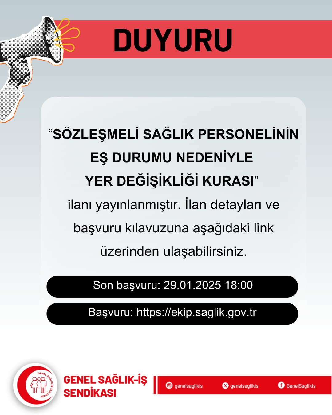 "Sözleşmeli Sağlık Personelinin Eş Durumu Nedeniyle Yer Değişikliği Kurası" ilanı yayınlanmıştır. İlan detayları ve başvuru kılavuzuna aşağıdaki link üzerinden ulaşabilirsiniz.