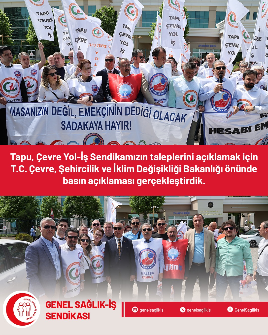8. Dönem Toplu Sözleşme Görüşmeleri sürecinde Konfederasyonumuz Birleşik Kamu-İş ve bağlı sendikalarımızla birlikte Tapu, Çevre Yol-İş Sendikamızın taleplerini açıklamak için T.C. Çevre, Şehircilik ve İklim Değişikliği Bakanlığı önünde basın açıklaması gerçekleştirdik. Basın açıklamasına Sendikamız Genel Sağlık-İş Genel Başkanı Derya Uğur ve Genel Mali Sekreter Gazi Çeliker katılım sağladı.