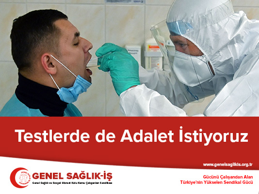 Yüksek risk altında hizmet vermelerine ve 100’ü aşkın kayıp vermelerine rağmen sağlık çalışanlarına pandeminin başından beri geçen 7 ayda düzenli PCR testi yapılmamıştır. Genel Sağlık-İş olarak bu konuda yaptığımız tüm çağrılar sonuçsuz kalmıştır. Sağlık çalışanlarına semptomatik olana kadar test yapılmamaktadır. Sağlık çalışanının sağlığı önemsenmemekte aynı zamanda asemptomatik dönemde bulaş riskini arttırmakta ve tedavinin aksamasına sebep olmaktadır.