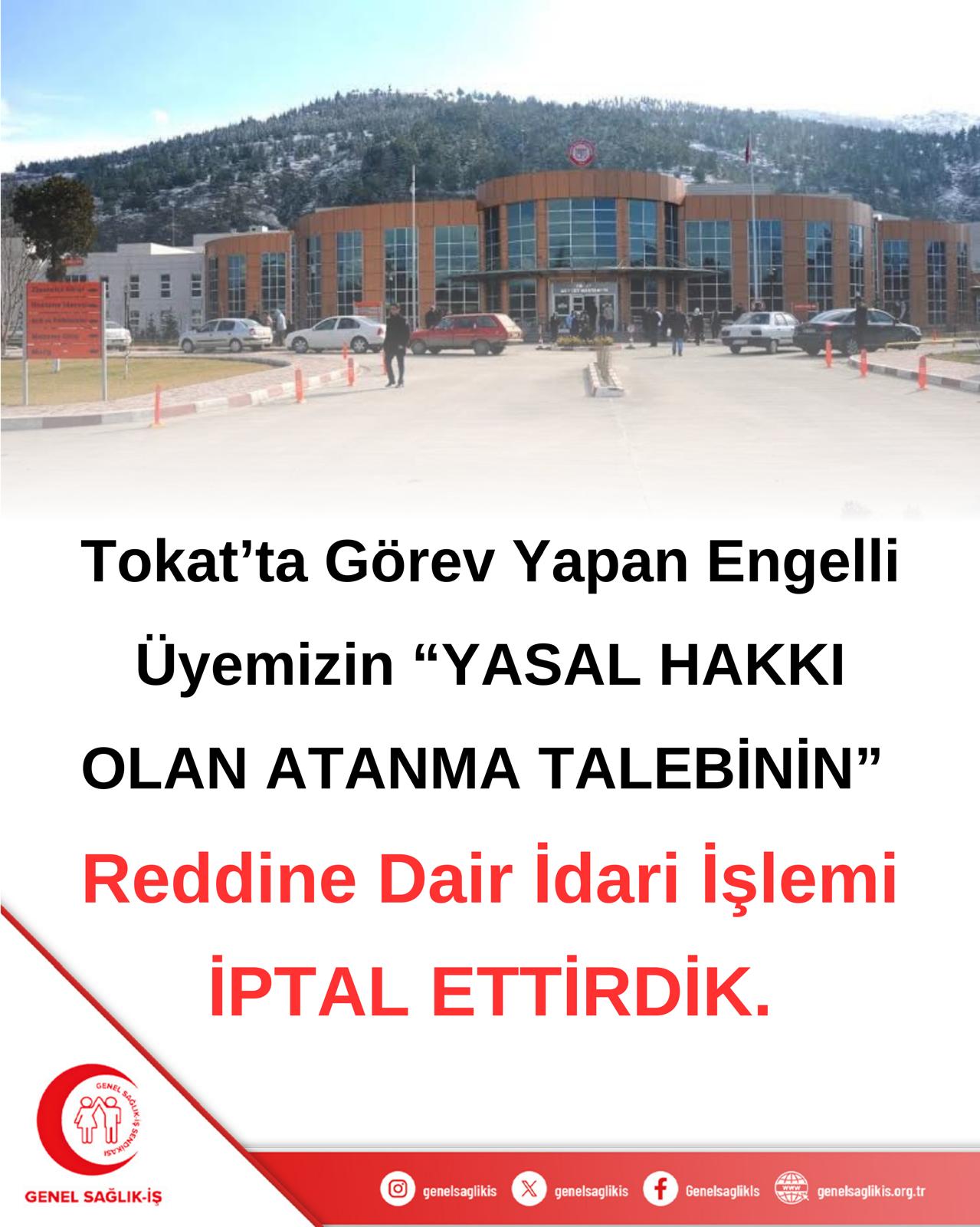 Tokat’ta bir devlet hastanesinde görev yapmakta olan üyemizin sağlık sorunları ve %50 engellilik durumu nedeniyle, mevcut görev yerinde görevine devam etmesi gün geçtikçe zorlaşması nedeniyle başka bir devlet hastanesine atamasının yapılması için idareye başvurmuştur. İdare, “üyemizin engellilik durumunu ve sağlık sorunlarını” dikkate almaksızın, başka bir hastaneye naklen atanması yönündeki talebinin reddetmiştir.