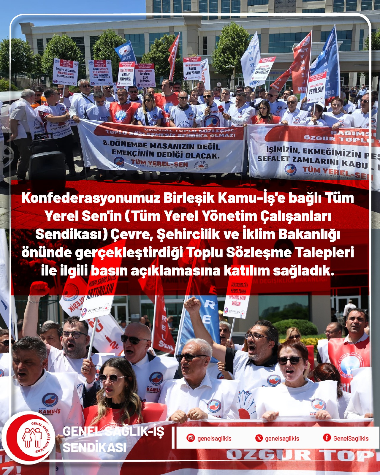 Konfederasyonumuz Birleşik Kamu-İş'e bağlı Tüm Yerel Sen'in (Tüm Yerel Yönetim Çalışanları Sendikası) Çevre, Şehircilik ve İklim Bakanlığı önünde gerçekleştirdiği Toplu Sözleşme Talepleri ile ilgili basın açıklamasına katılım sağladık.