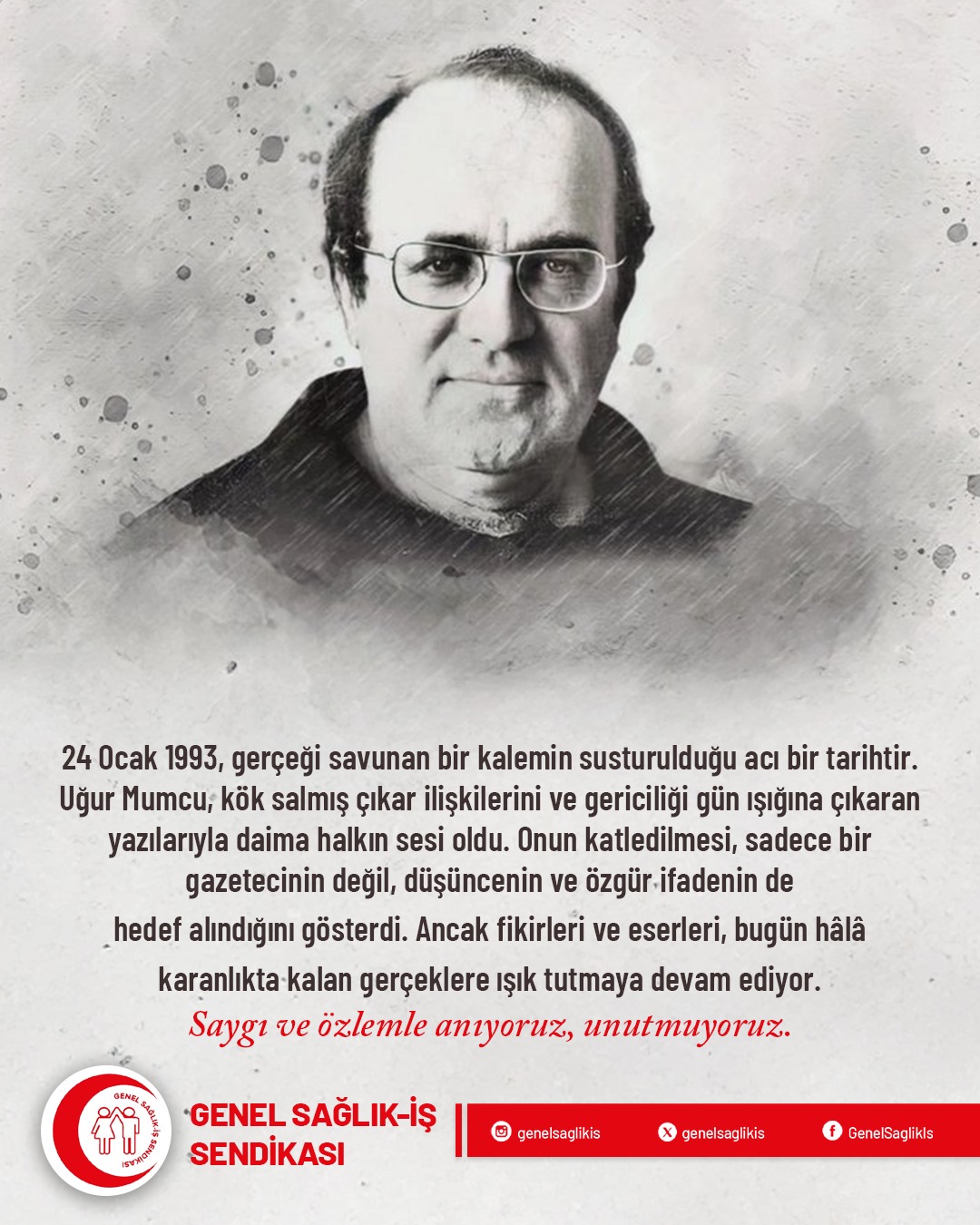 24 Ocak 1993, gerçeği savunan bir kalemin susturulduğu acı bir tarihtir. Uğur Mumcu, kök salmış çıkar ilişkilerini ve gericiliği gün ışığına çıkaran yazılarıyla daima halkın sesi oldu. Onun katledilmesi, sadece bir gazetecinin değil, düşüncenin ve özgür ifadenin de hedef alındığını gösterdi. Ancak fikirleri ve eserleri, bugün hâlâ karanlıkta kalan gerçeklere ışık tutmaya devam ediyor. Saygı ve özlemle anıyoruz, unutmuyoruz.