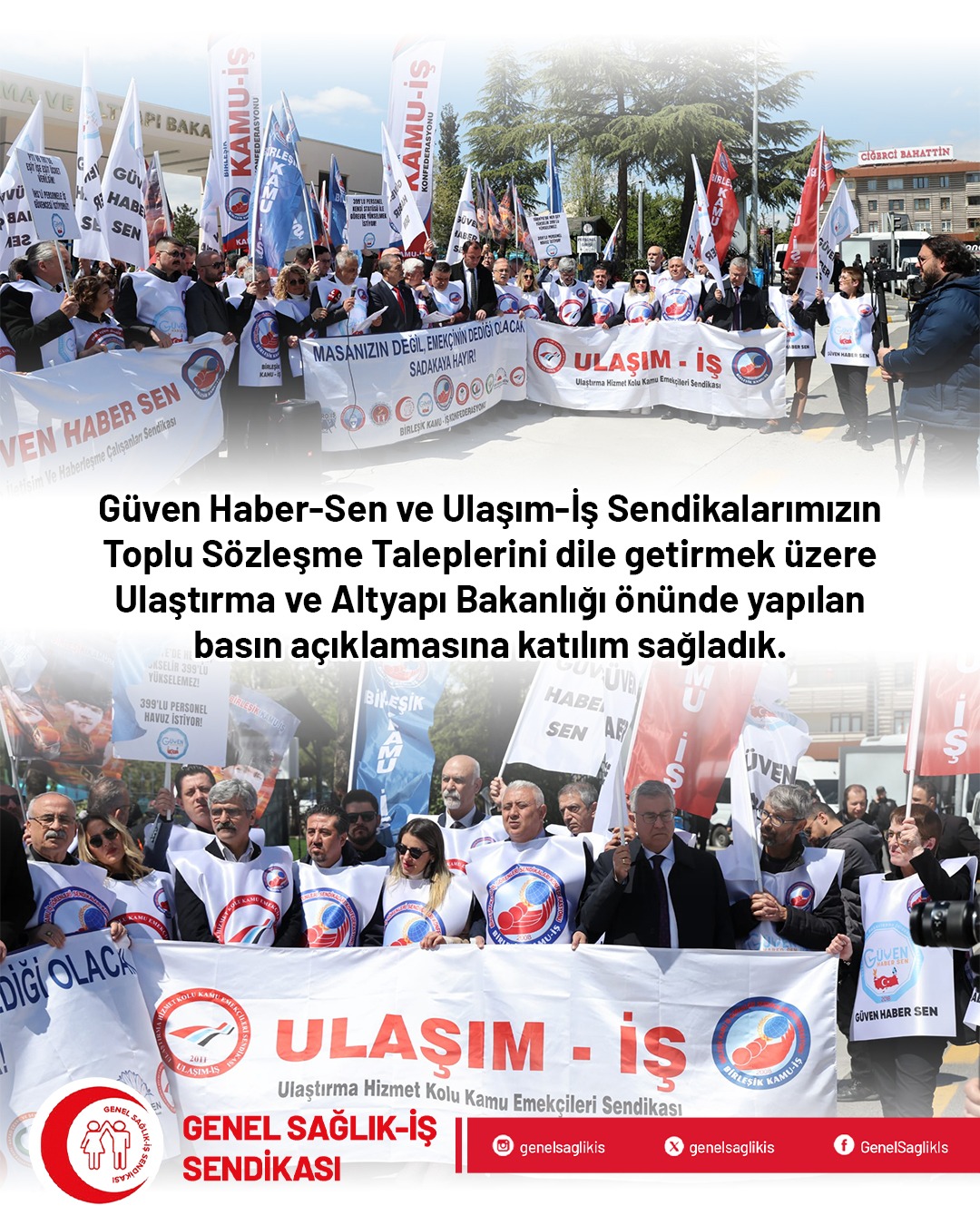Güven Haber-Sen ve Ulaşım-İş Sendikalarımızın Toplu Sözleşme Taleplerini dile getirmek üzere Ulaştırma ve Altyapı Bakanlığı önünde yapılan basın açıklamasına katılım sağladık.
