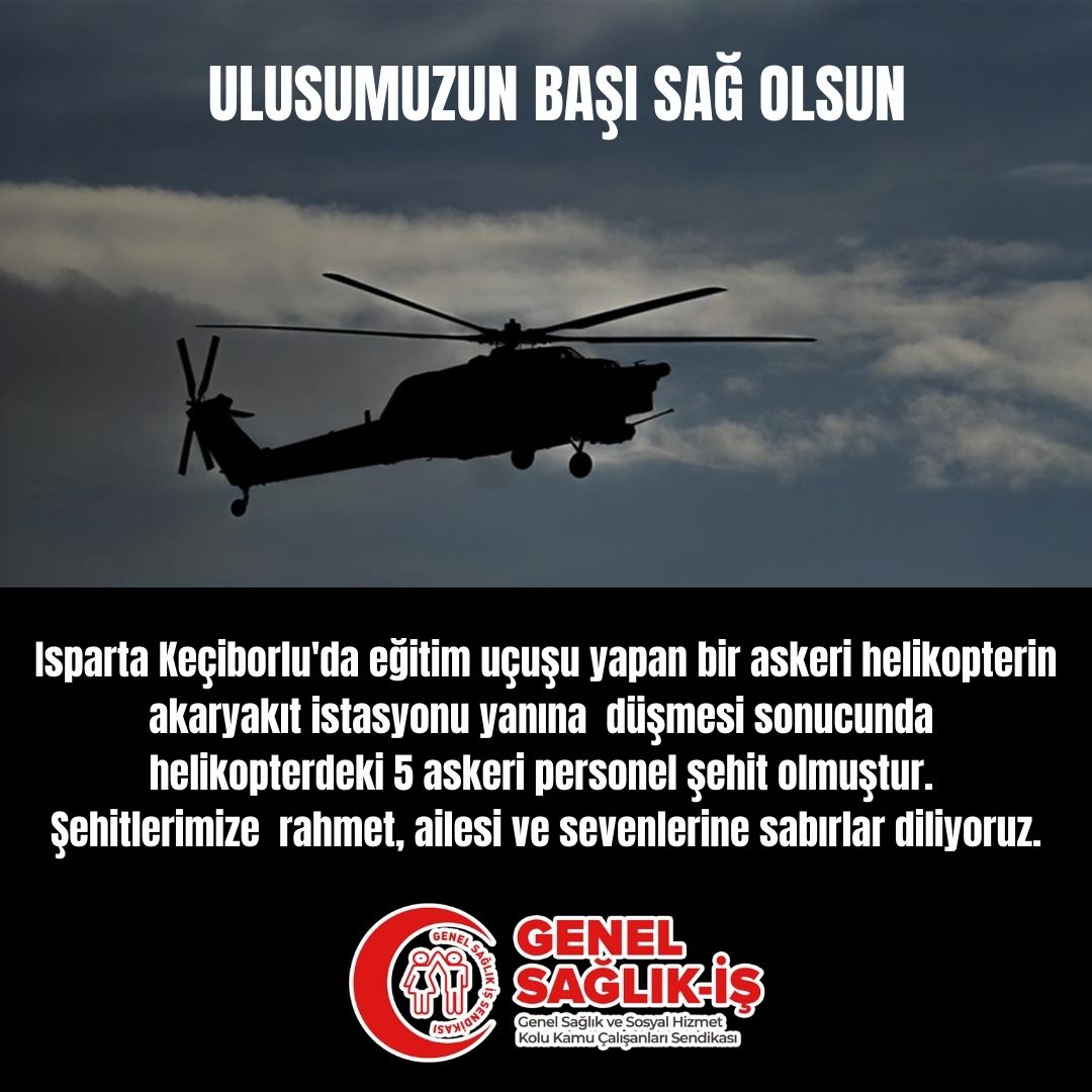 Isparta Keçiborlu'da eğitim uçuşu yapan bir askeri helikopterin akaryakıt istasyonu yanına düşmesi sonucunda helikopterdeki 5 askeri personel şehit olmuştur. Şehitlerimize rahmet, ailesi ve sevenlerine sabırlar diliyoruz.