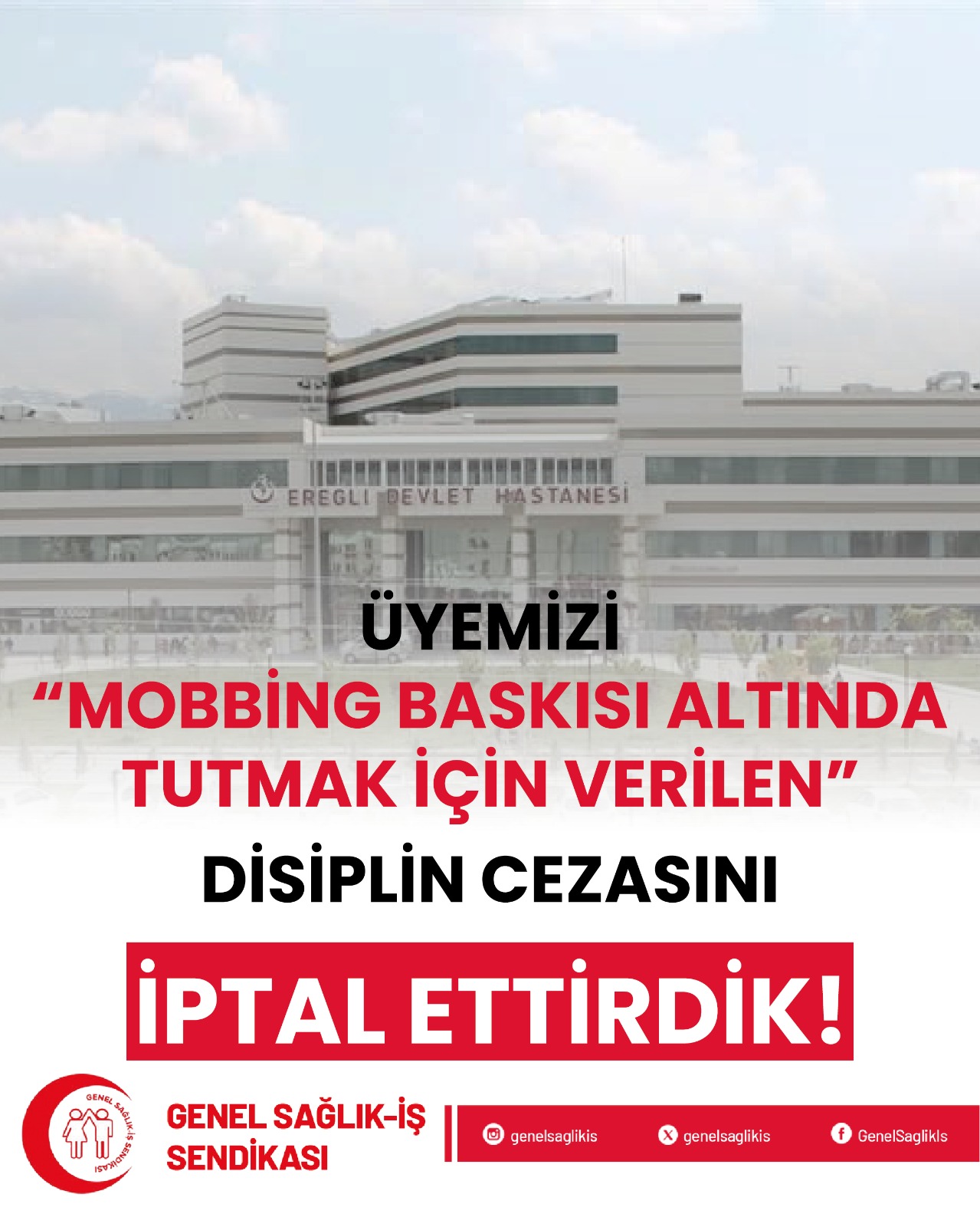 Konya İli Ereğli Devlet Hastanesi’nde “hemşire” olarak görev yapmakta iken, icap nöbetine ilişkin hak edişleriyle ilgili Sendikamız aracılığıyla haklarını arayan üyemiz, idarece, adeta hasım mevkiine alınmıştır. Bu nedenle, üyemizin tamamen haklı olduğu bir konuda hakkında disiplin soruşturması başlatılmış, uyarma cezası verilmiş; bununla da kalınmayarak, söz konusu uyarma cezası gerekçe gösterilerek, Emirgazi Devlet Hastanesine naklen atanmasına karar verilmiştir.