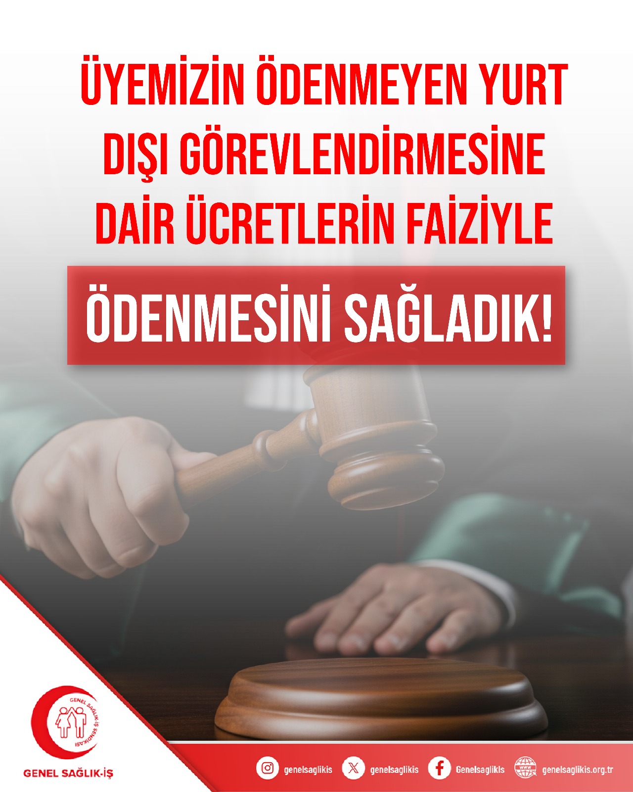 Manisa Şehir Hastanesinde perfüzyonist olarak görev yapmaktayken Sağlık Bakanlığının işlemi ile Kırgızistan’da bulunan Kırgız-Türk Dostluk Hastanesinde görevlendirilen üyemize yurt dışı görevlendirmesinde geçirmiş olduğu süreye ilişkin ücretler ödenmemiş, bunun üzerine üyemize hukuki destek vererek ücretlerin Bakanlıkça ödenmesi sağlanmıştır. Ancak Bakanlık, üyemizin yurt dışında geçirmiş olduğu sürelere ilişkin ücretlerini geç ödemesine rağmen hukuken ücretlere işletilmesi gereken faizi üyemize ödememiş, üyemizin faiz ödenmesine ilişkin başvurusunu ise zımnen reddetmiştir.