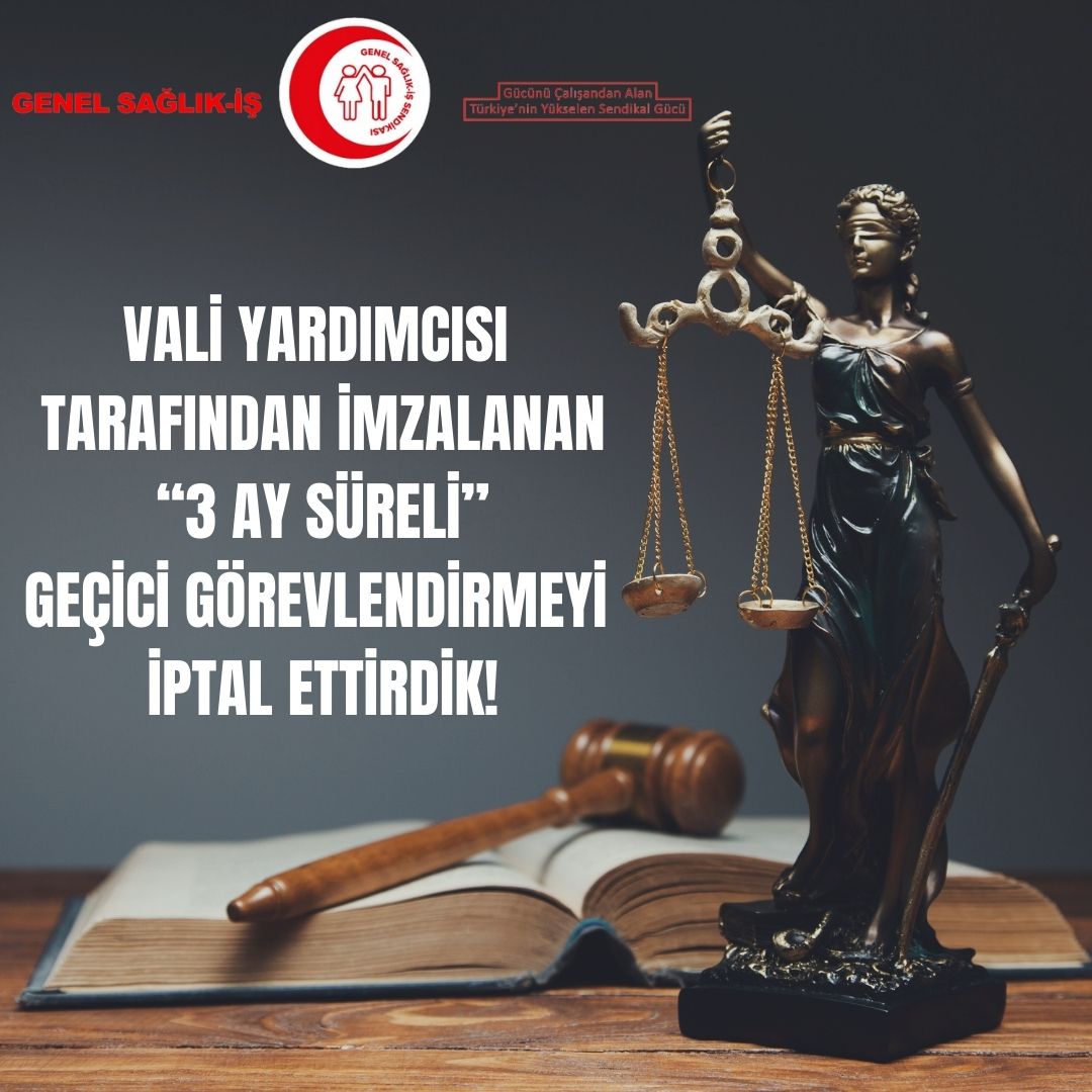 Üyemiz, haksız ve hukuka aykırı geçici görevlendirme nedeniyle, mağduriyetinin giderilmesi talebiyle Sendikamız Genel Sağlık-İş’e başvurmuştur. Sendikamız Hukuk Müşavirliği, üyemizin mağduriyetinin giderilmesi için derhal girişimlere başlamış, Manisa 2. İdare Mahkemesi’nde iptal davası açılmıştır. Açılan davada, “geçici görevlendirme idari işleminin, Vali Yardımcısı tarafından onaylanması nedeniyle yetki yönünden hukuka aykırı olduğu, 1 mali yılda 2 ayı aşan geçici görevlendirme süresinin hukuka ve yasaya aykırı olduğu” belirtilmiştir.