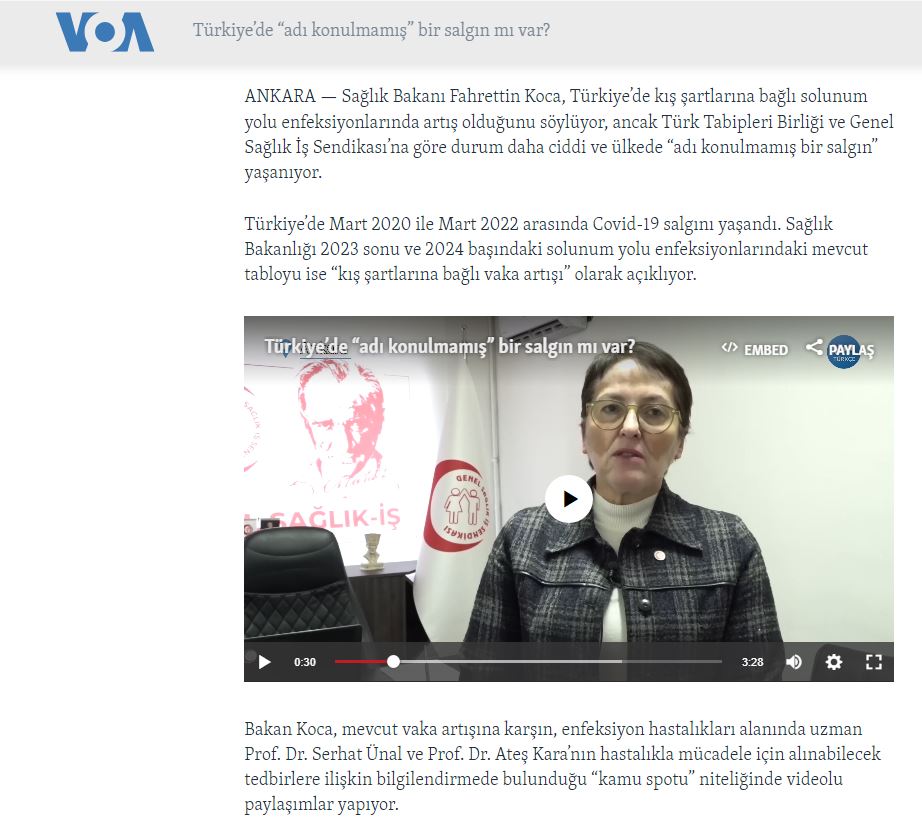 Sendikamız Genel Sağlık-İş'in 18.1.2024 tarihinde Voice of America'da yayınlanan yazılı ve görsel haber linki: https://d33vxfhewnqf4z.cloudfront.net/a/turkiyede-adi-konulmamis-bir-salgin-mi-yasaniyor/7443505.html
