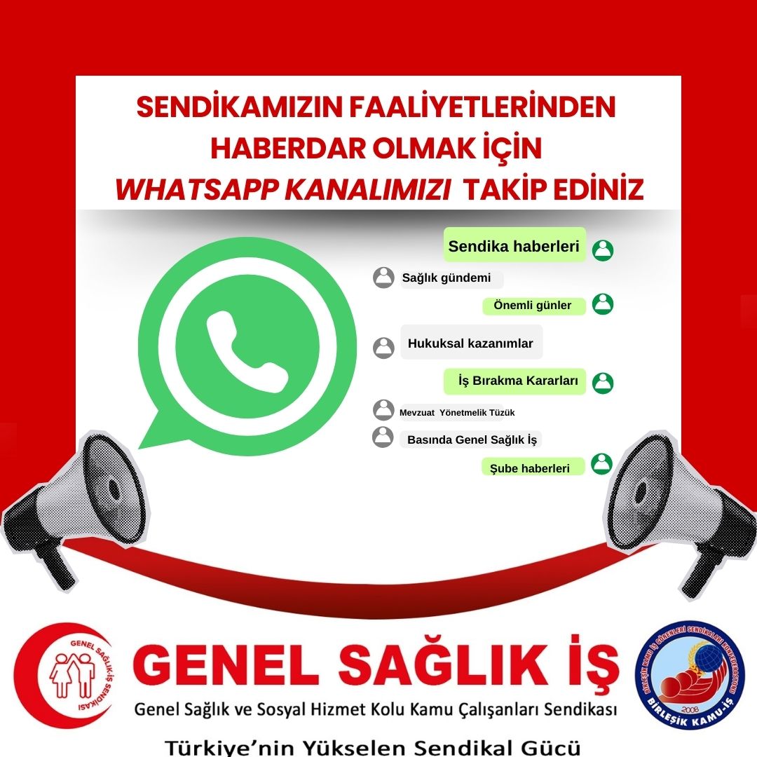 Sendikamızın çalışmalarını, sağlık gündemini, hukuksal kazanımları, şube haberleri ve basında Genel Sağlık-İş'i takip etmek için Whatsapp kanalımıza bekliyoruz...