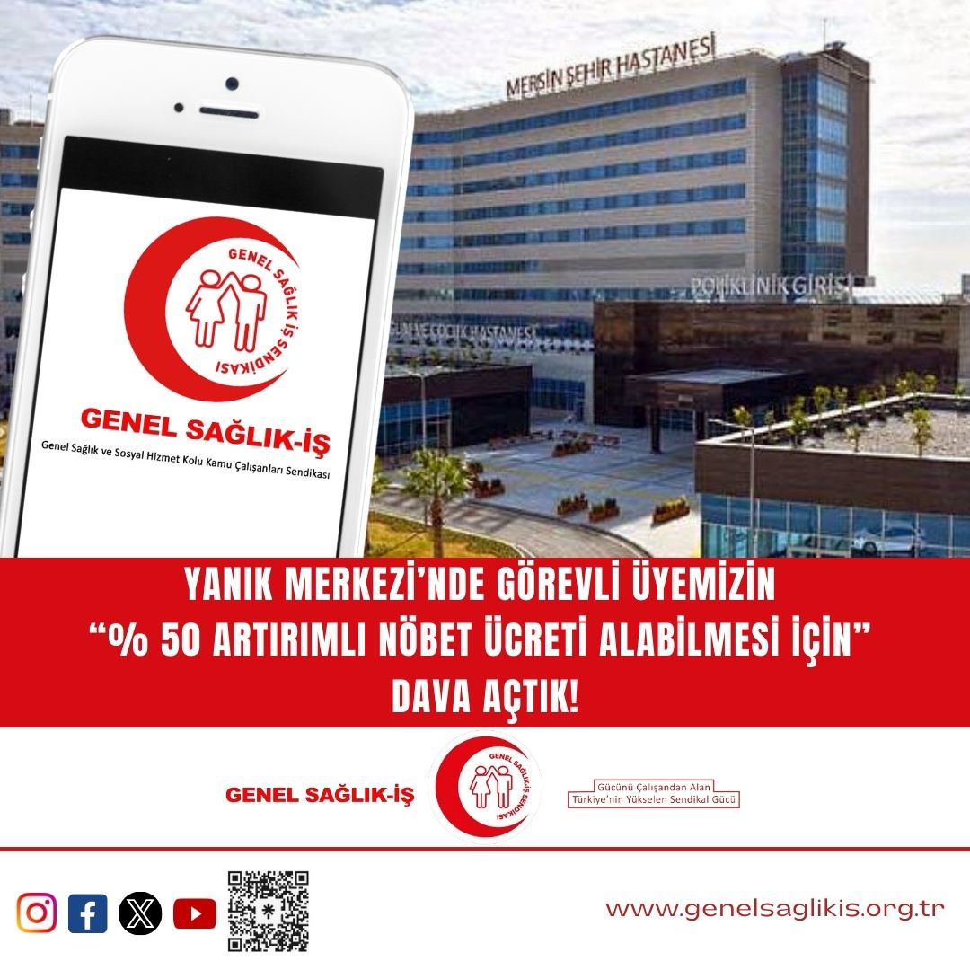 Talep üzere, başvuru dilekçeleri, Sendikamız Hukuk Müşavirliği tarafından hazırlanmış, üyelerimize gönderilmiştir. İdarenin cevabı ise, “657 sayılı DMK’nın Ek 33. maddesinde “Yanık Merkezinin” bulunmaması nedeniyle %50 artırımlı nöbet ücreti ödenemeyeceği” şeklinde olmuştur. Bu yanıt üzerine, Sendikamız ve Sendikamız Hukuk Müşavirliği girişimde bulunmaktan kaçınmamış, Mersin 2. İdare Mahkemesi’nde dava açılmıştır.