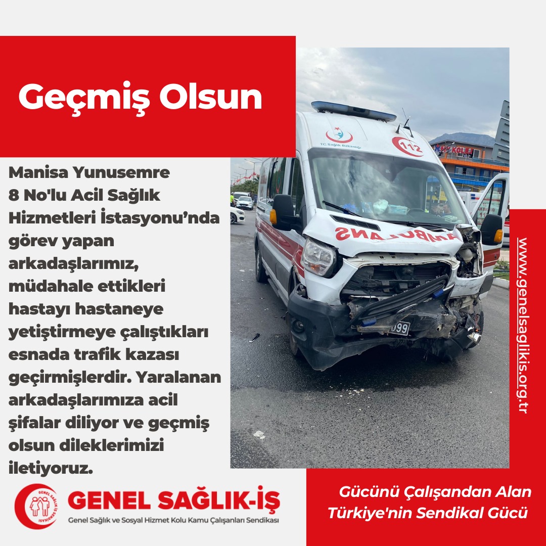 Manisa Yunusemre 8 No'lu Acil Sağlık Hizmetleri İstasyonu'nda görev yapan arkadaşlarımız, müdahale ettikleri hastayı hastaneye yetiştirmeye çalıştıkları esnada trafik kazası geçirmişlerdir. Yaralanan arkadaşlarımıza acil şifalar diliyor ve geçmiş olsun dileklerimizi iletiyoruz.