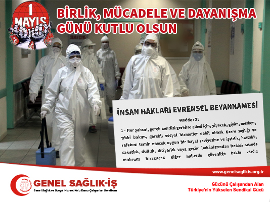 Pandemi sürecinde iş yükleri artarken, ücretleri eriyen sağlık çalışanları; 1 Mayıs Birlik, Mücadele ve Dayanışma Gününü, "can kurtarmak" adına çalışarak kutlamaktadır. Yurttaşlarımızın “yaşam ve sağlık hakkı” için mücadele veren sağlık çalışanları, kimi zaman kendi sağlığından olmakta ancak emeğinin karşılığını alamamaktadır. Sağlık çalışanları, sağlıklı, güvenceli, insan onuruna yaraşır çalışma ve yaşam koşulları istemektedir.