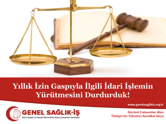 Kararı değerlendiren Sendikamız Genel Sağlık-İş Genel Başkanı Dr. Derya Uğur, “Üyelerinin her türlü hukuksal sorununda onların yanında yer alan ve onlara her türlü desteği veren Genel Sağlık-İş, her zaman olduğu gibi yine “emsal bir karara” imza atmıştır. İdare, hukuku ve usulü işlemleri görmezden gelerek, üyemizin “yıllık izin” hakkını gasp etmiş, Anayasa’nın 50. maddesine aykırı eylemde bulunularak, “dinlenme hakkı” ihlal edilmiştir. Söz konusu hukuka aykırılık karşısında, Genel Sağlık-İş, yine sessiz kalmamış, haklı hukuk mücadelesini sonuna kadar vermiş, yine mükemmel bir hukuki kazanım elde edilmiştir. Bu vesileyle, tüm sağlık emekçilerini “gerçek mücadele Sendikası” olan Genel Sağlık-İş çatısı altında toplanmaya davet ediyoruz.