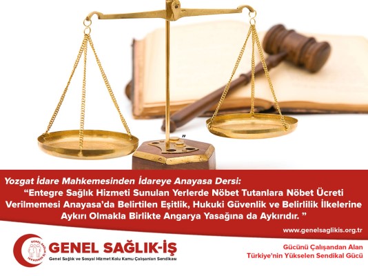 Sendikamız Genel Sağlık-İş tarafından, 2014 yılından beri ödenmemiş nöbet ücretlerinin kendisine ödenmesi için Yozgat İdare Mahkemesinde dava açılmıştır. Yargılama sonucunda Yozgat İdare Mahkemesince dava konusu işlemin iptaline yani ödeme yapılmaması işlemini iptal ederken kararında şu gerekçeye yer vermiştir: